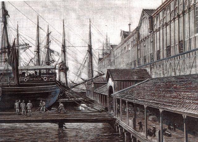 Relata el historiador antes mencionado, que el primer proyecto se edificó entre 1849 y 1850 y a pesar de los obstáculos en los dos años siguientes, lograron ampliar y mejorar estos almacenes hacia 1853 y 1854, especialmente con la construcción de un cómodo muelle de 16 pies de fondo, en el cual podían atracar las goletas de cabotaje y ahorrarse de esta manera los gastos de la carga y descarga con las lanchas. Las obras fueron concebidas y dirigidas por el ingeniero Julio Sagebien.