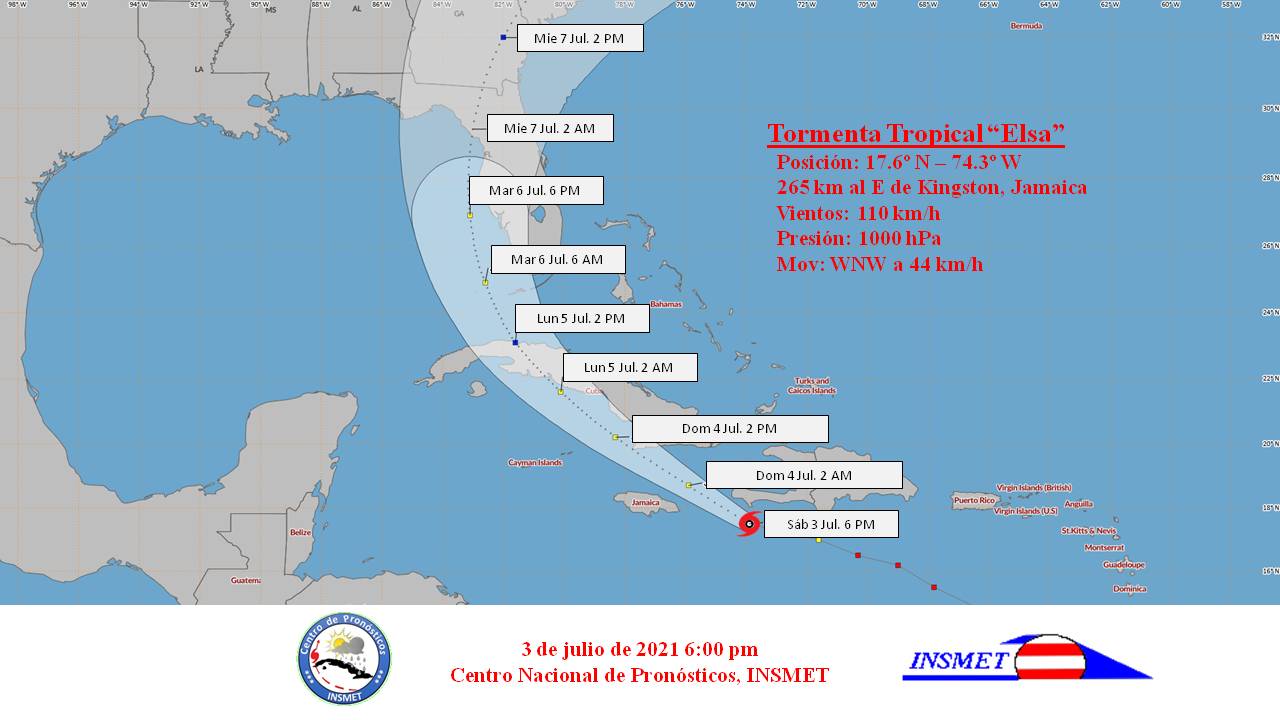Según la trayectoria pronosticada, Elsa continuará transitando sobre el estrecho de Colón, entre el norte de Jamaica y la costa meridional del oriente de Cuba, mientras mantiene su rumbo medio hacia el oeste-noroeste con algunas fluctuaciones en la intensidad del los vientos.