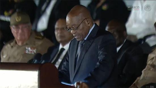 El presidente de Sudáfrica, Jacob Zuma, afirmó por su parte que el pueblo y gobierno de su país conocieron con tristeza del fallecimiento de uno de los grandes revolucionarios de nuestro tiempo y uno de los grandes héroes de nuestro tiempo: Fidel Castro Ruz.