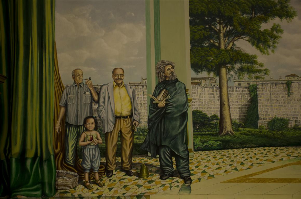 »Vas a ver que tiene a Enrique con el badajo y la campana porque Eusebio Leal había dicho en determinado momento que él era la persona designada para reinaugurarlo. Y Robreño sale al lado de Enrique porque este había expresado que él estaba seguro que Robreño si reabriría el teatro. Decía: Robreño no es inmortal pero es inmorible, y está con una canasta también porque cuenta Núñez Rodríguez que Robreño había nacido en las canastas que las actrices llevaban a los ensayos y, por el contrario, él había nacido en el campo y después en un gran salto vino aquí a estar rodeado de todas esas figuras importantes de las tablas. Y sale la inocencia representada por una niña que tiene una manzana, por la anécdota que leí, muy bonita del vínculo que hay entre la inocencia y la locura, cuando Leal cuenta que a él de niño el Caballero de Paris le regaló una manzana muy roja en la mano. Entonces como él no quiso que lo retratara, esa es la verdad, él como gente inteligente que es, sabía que lo iba a caricaturizar y todo el mundo lo identificaría y no quiso que hubiera ninguna figura viva.