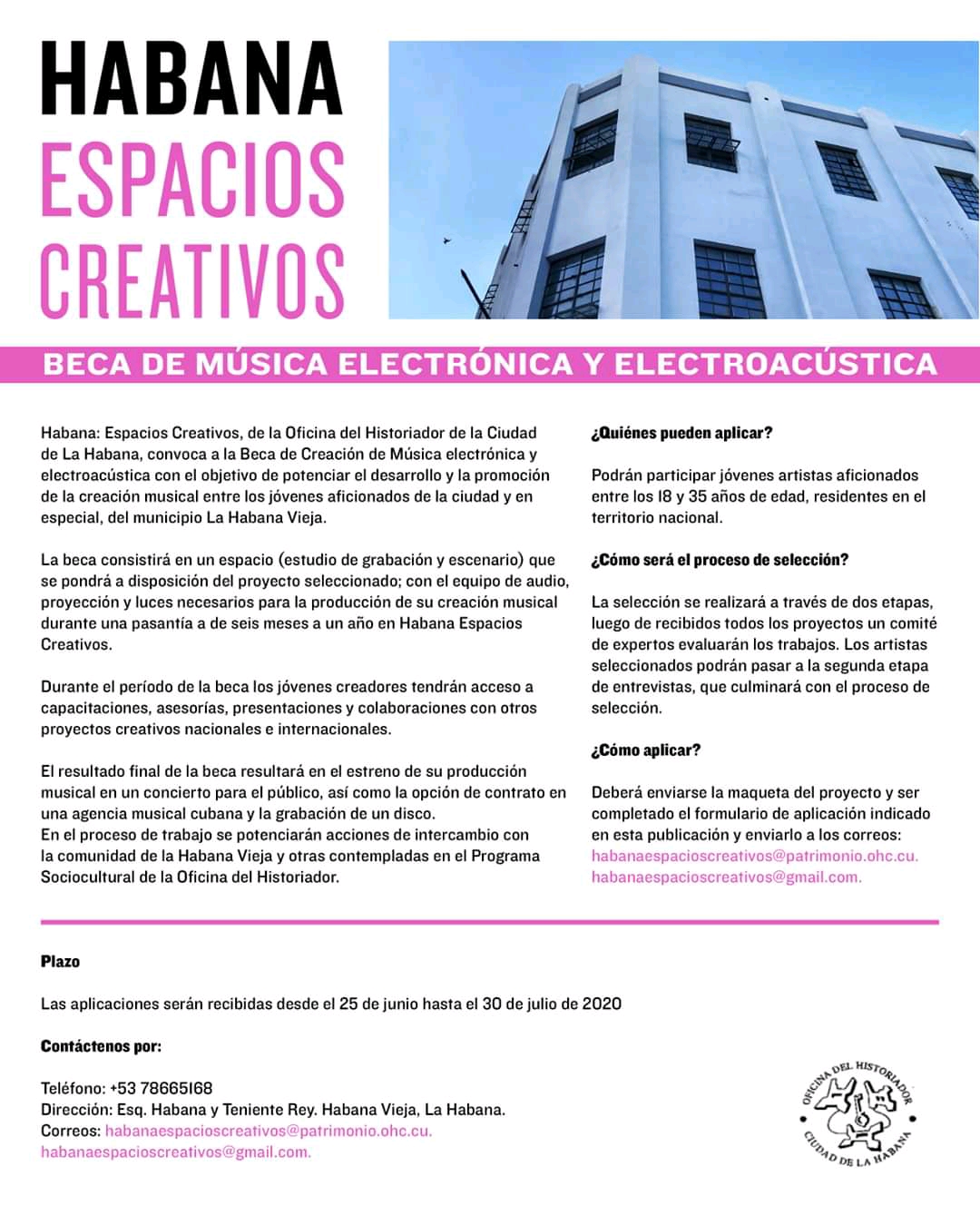 La institución, que recién arranca con sus actividades este 2020, ha compartido a través de su perfil en la red social Facebook “Habana: Espacios Creativos”, una serie de convocatorias con el objetivo de llamar la atención de su público meta.