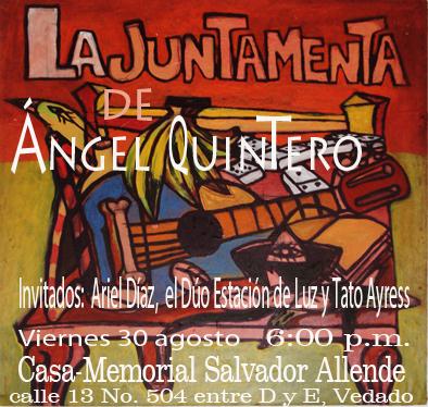 |La Juntamenta —proyecto del trovador Ángel Quintero auspiciado por el Instituto Cubano de Amistad con los Pueblos, ICAP— despide el verano este viernes 30, a las seis de la tarde, en la sede de la Casa-Memorial Salvador Allende(calle 13, No. 504, entre D y E, Vedado, La Habana) y en esta oportunidad estarán como invitados el trovador Ariel Díaz y el dúo Estación de Luz.