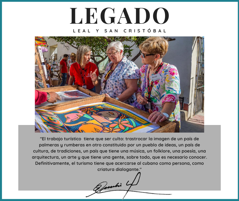 “Nos dimos cuenta de que Leal fue un hombre que como mismo trabajó y conceptualizó la restauración y la comunicación, fue un hombre que entendió y defendió el turismo, además de un guía excepcional. Fue un hombre que también diseñaba productos turísticos –recuerdo en una de esas conferencias magistrales cómo a partir de su intervención se podía visualizar e imaginar la ruta gastronómica de la cocina típica cubana, o la flora y la fauna– con esa oratoria y esa locuacidad extraordinaria, generaba todas esas motivaciones que son típicas de un verdadero intérprete del patrimonio; de la persona que no solo lo comunica, sino que genera sensaciones más allá de la comunicación y que logra emocionar, conmover, identificar e incluso genera participación en muchas de esas personas que lo están escuchando. Su empeño siempre fue tratar de formar más que guías, intérpretes del patrimonio, personas que lograran comunicar e interpretar tanto la memoria histórica como la riqueza patrimonial.